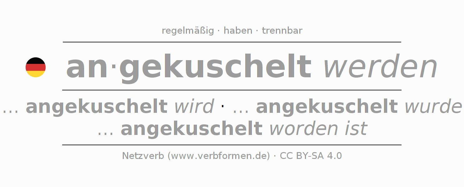 Die Konjugation von ankuscheln im Infinitiv Präsens Perfekt Grundform Vorgangspassiv ist: angekuschelt werden, angekuschelt zu werden.Die Bildung dieser Formen entspricht gewissen grammatischen Regeln. So auch die Vorgaben zur Konjugation der einfachen Verbformen von ankuscheln im Infinitiv. Kommentare ☆