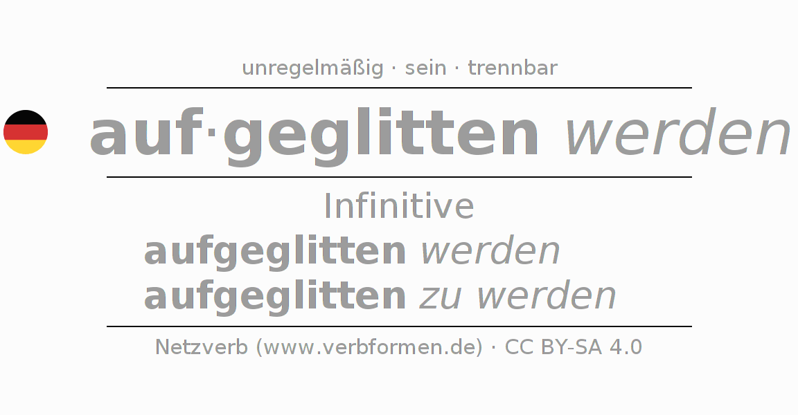 Die Konjugation von aufgleiten im Infinitiv Präsens Perfekt Grundform Vorgangspassiv ist: aufgeglitten werden, aufgeglitten zu werden.Die Bildung dieser Formen entspricht gewissen grammatischen Regeln. So auch die Vorgaben zur Konjugation der einfachen Verbformen von aufgleiten im Infinitiv. Kommentare ☆