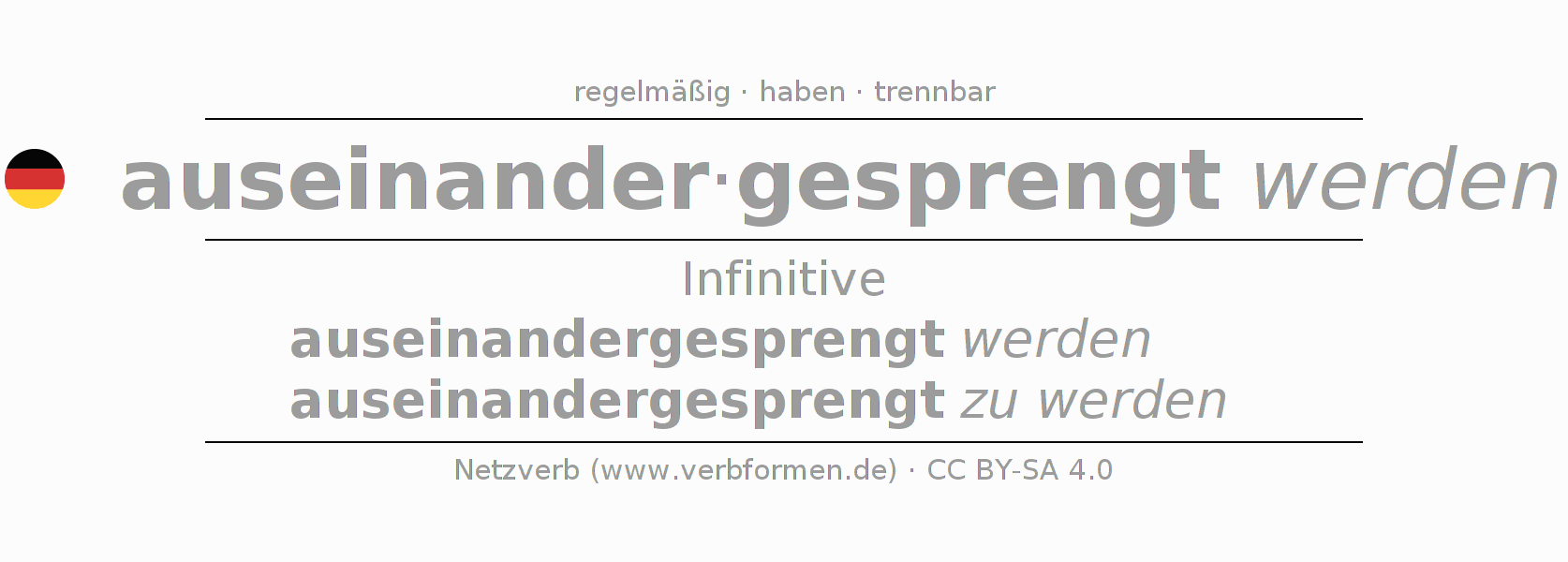 Das Verb auseinandersprengen (hat) vollständig in allen Personen und Numeri im Infinitiv Präsens Perfekt konjugiert