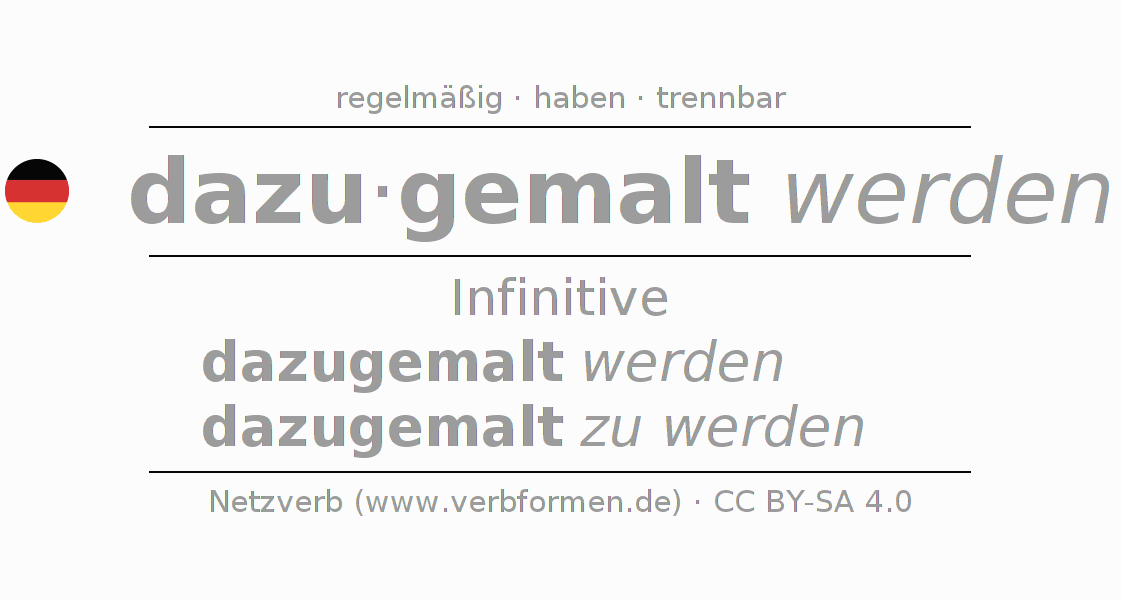 Die Konjugation von dazumalen im Infinitiv Präsens Perfekt Grundform Vorgangspassiv ist: dazugemalt werden, dazugemalt zu werden.Die Bildung dieser Formen entspricht gewissen grammatischen Regeln. So auch die Vorgaben zur Konjugation der einfachen Verbformen von dazumalen im Infinitiv. Kommentare ☆