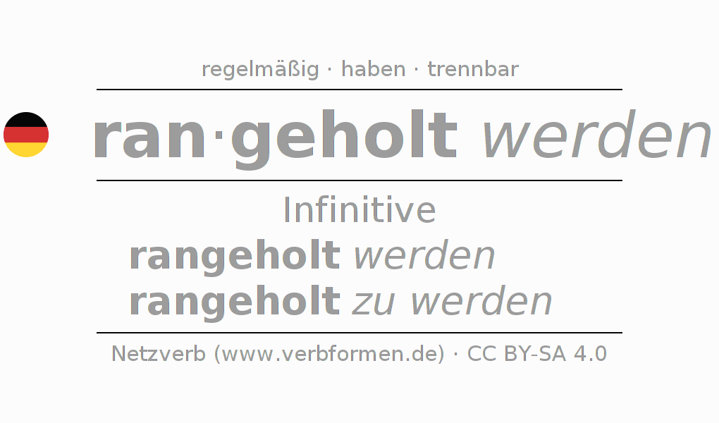 Die Konjugation von ranholen im Infinitiv Präsens Perfekt Grundform Vorgangspassiv ist: rangeholt werden, rangeholt zu werden.Die Bildung dieser Formen entspricht gewissen grammatischen Regeln. So auch die Vorgaben zur Konjugation der einfachen Verbformen von ranholen im Infinitiv. Kommentare ☆