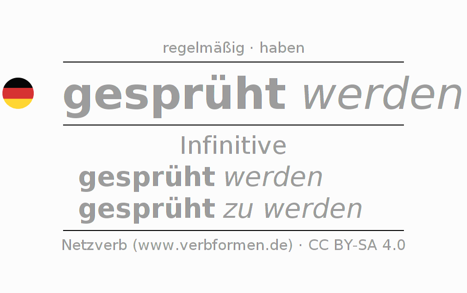 Das Verb sprühen (hat) vollständig in allen Personen und Numeri im Infinitiv Präsens Perfekt konjugiert