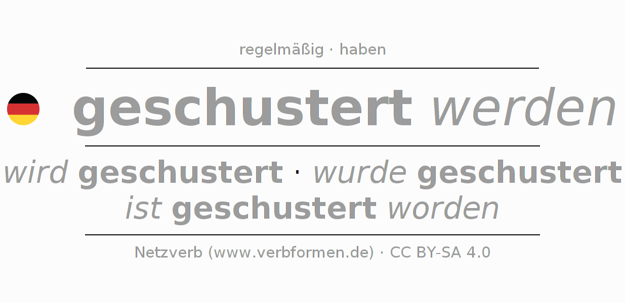 Die Konjugation von schustern im Infinitiv Präsens Perfekt Grundform Vorgangspassiv ist: geschustert werden, geschustert zu werden.Die Bildung dieser Formen entspricht gewissen grammatischen Regeln. So auch die Vorgaben zur Konjugation der einfachen Verbformen von schustern im Infinitiv. Kommentare ☆
