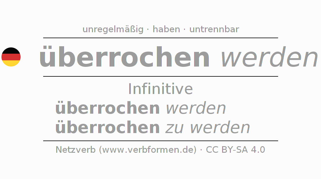 Die Konjugation von überriechen im Infinitiv Präsens Perfekt Grundform Vorgangspassiv ist: überrochen werden, überrochen zu werden.Die Bildung dieser Formen entspricht gewissen grammatischen Regeln. So auch die Vorgaben zur Konjugation der einfachen Verbformen von überriechen im Infinitiv. Kommentare ☆