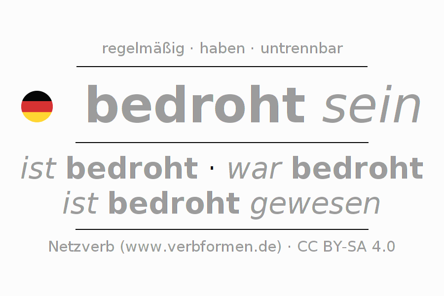 Das Verb bedrohen vollständig in allen Personen und Numeri im Infinitiv Präsens Perfekt konjugiert