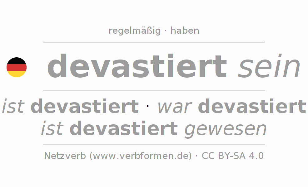Die Konjugation von devastieren im Infinitiv Präsens Perfekt Grundform Zustandspassiv ist: devastiert sein, devastiert zu sein.Die Bildung dieser Formen entspricht gewissen grammatischen Regeln. So auch die Vorgaben zur Konjugation der einfachen Verbformen von devastieren im Infinitiv. Kommentare ☆