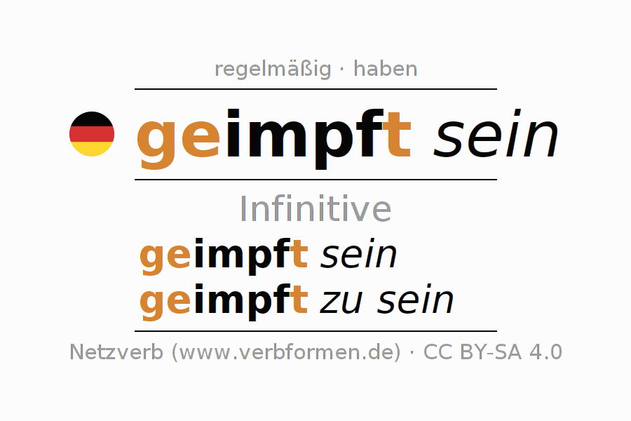 Die Konjugation von impfen im Infinitiv Präsens Perfekt Grundform Zustandspassiv ist: geimpft sein, geimpft zu sein.Die Bildung dieser Formen entspricht gewissen grammatischen Regeln. So auch die Vorgaben zur Konjugation der einfachen Verbformen von impfen im Infinitiv. Kommentare ☆