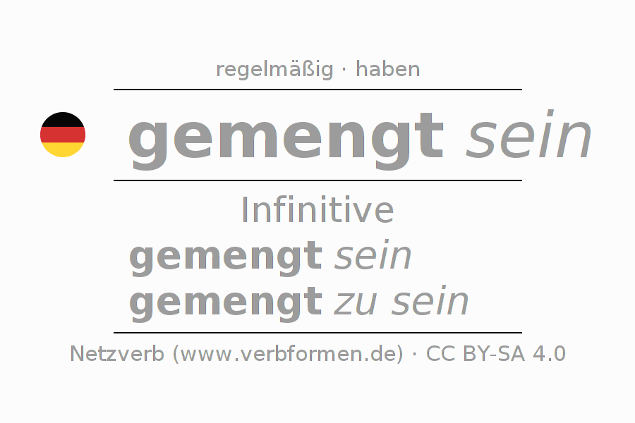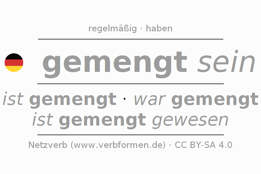 Die Konjugation von mengen im Infinitiv Präsens Perfekt Grundform Zustandspassiv ist: gemengt sein, gemengt zu sein.Die Bildung dieser Formen entspricht gewissen grammatischen Regeln. So auch die Vorgaben zur Konjugation der einfachen Verbformen von mengen im Infinitiv. Kommentare ☆