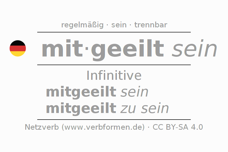 Die Konjugation von miteilen im Infinitiv Präsens Perfekt Grundform Zustandspassiv ist: mitgeeilt sein, mitgeeilt zu sein.Die Bildung dieser Formen entspricht gewissen grammatischen Regeln. So auch die Vorgaben zur Konjugation der einfachen Verbformen von miteilen im Infinitiv. Kommentare ☆