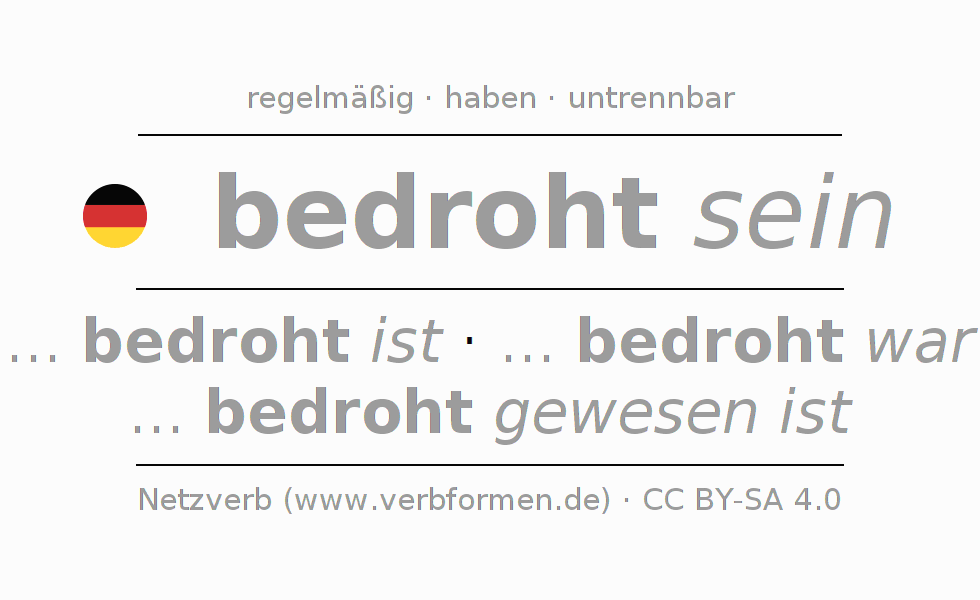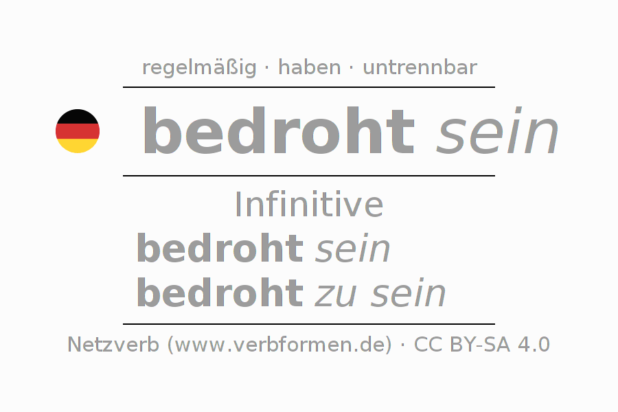 Das Verb bedrohen vollständig in allen Personen und Numeri im Infinitiv Präsens Perfekt konjugiert
