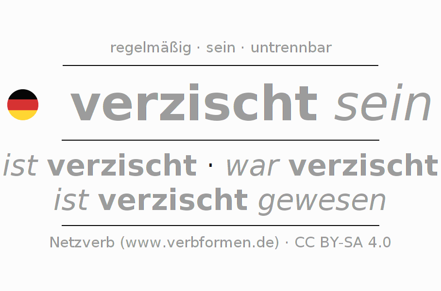 Die Konjugation von verzischen im Infinitiv Präsens Perfekt Grundform Zustandspassiv ist: verzischt sein, verzischt zu sein.Die Bildung dieser Formen entspricht gewissen grammatischen Regeln. So auch die Vorgaben zur Konjugation der einfachen Verbformen von verzischen im Infinitiv. Kommentare ☆