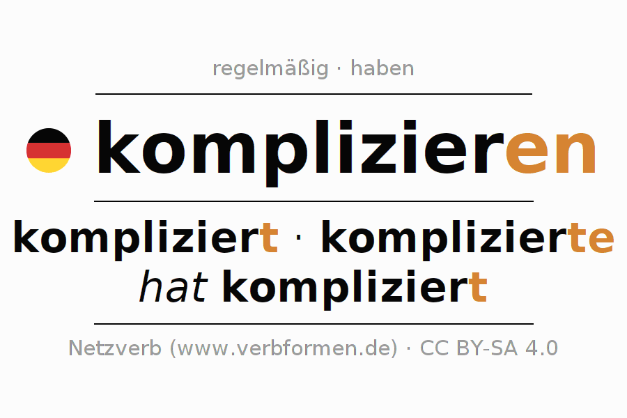 Die komplizieren Konjugation online als Verbtabelle mit allen Verbformen in Singular (Einzahl) und Plural (Mehrzahl) in allen Personen (1. Person, 2.Person, 3. Person) übersichtlich dargestellt. Die Beugung bzw. Flexion des Verbs komplizieren ist somit eine Hilfestellung für Hausaufgaben, Prüfungen, Klausuren, für den Deutschuntericht der Schule, zum Deutsch Lernen, für das Studium, Deutsch als Fremdsprache (DaZ), Deutsch als Zweitsprache (DaZ) und für die Erwachsenenbildung. Gerade auch für Deutschlernende ist die korrekte Konjugation des Verbs bzw. die korrekt flektierten Formen (kompliziert - komplizierte - hat kompliziert) entscheidend. Weitere Informationen finden sich unter Wiktionary komplizieren und unter komplizieren im Duden.