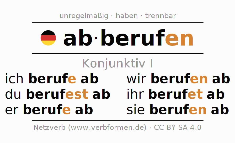 Das Verb abberufen vollständig in allen Personen und Numeri im Konjunktiv Präsens konjugiert