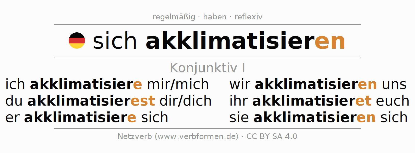 - ich akklimatisiere mir/mich (1. PersonSingular)