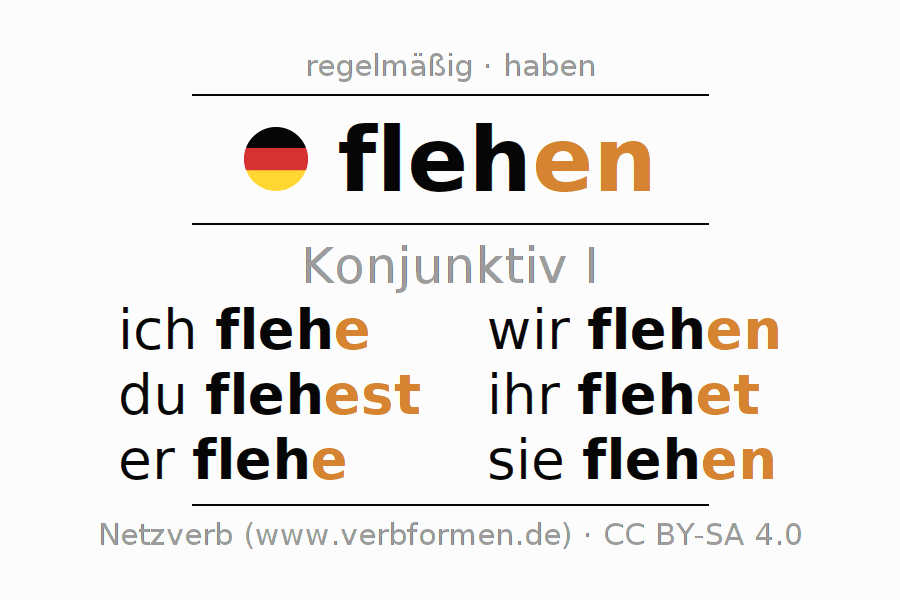 Das Verb flehen vollständig in allen Personen und Numeri im Konjunktiv Präsens konjugiert