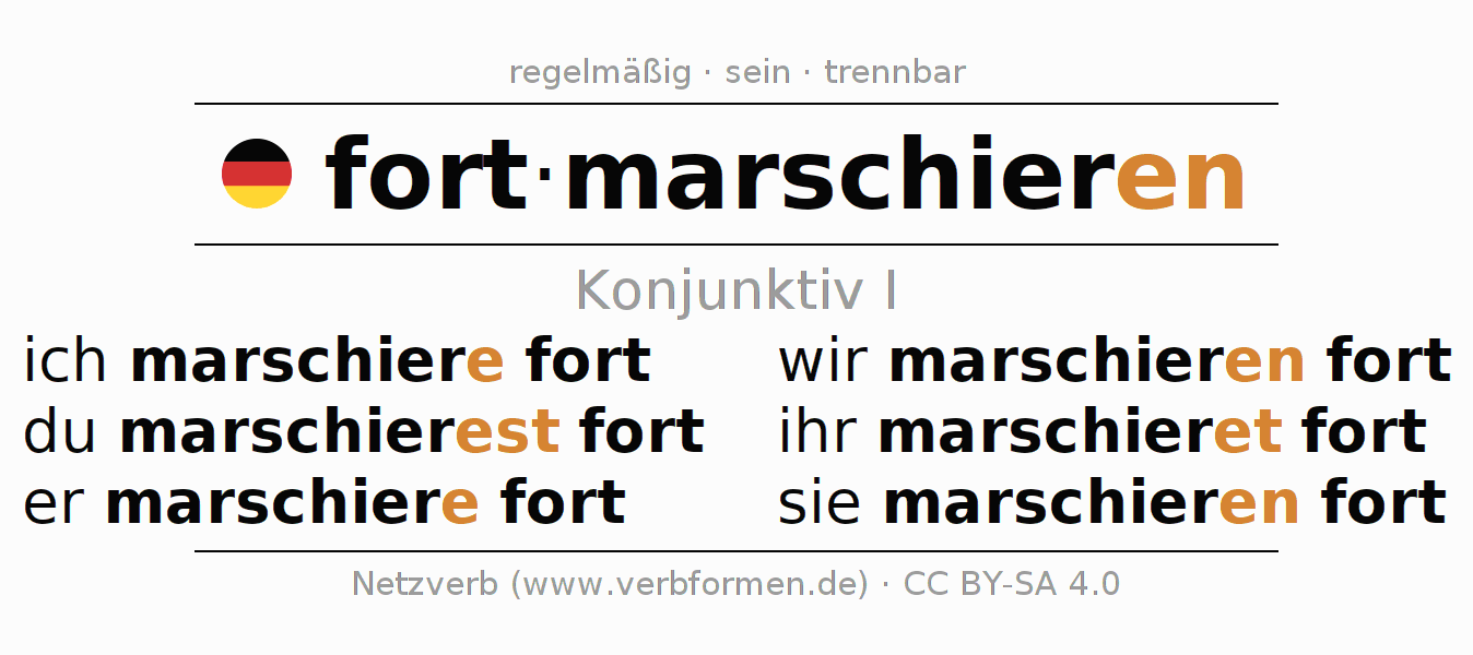 Das Verb fortmarschieren vollständig in allen Personen und Numeri im Konjunktiv Präsens konjugiert