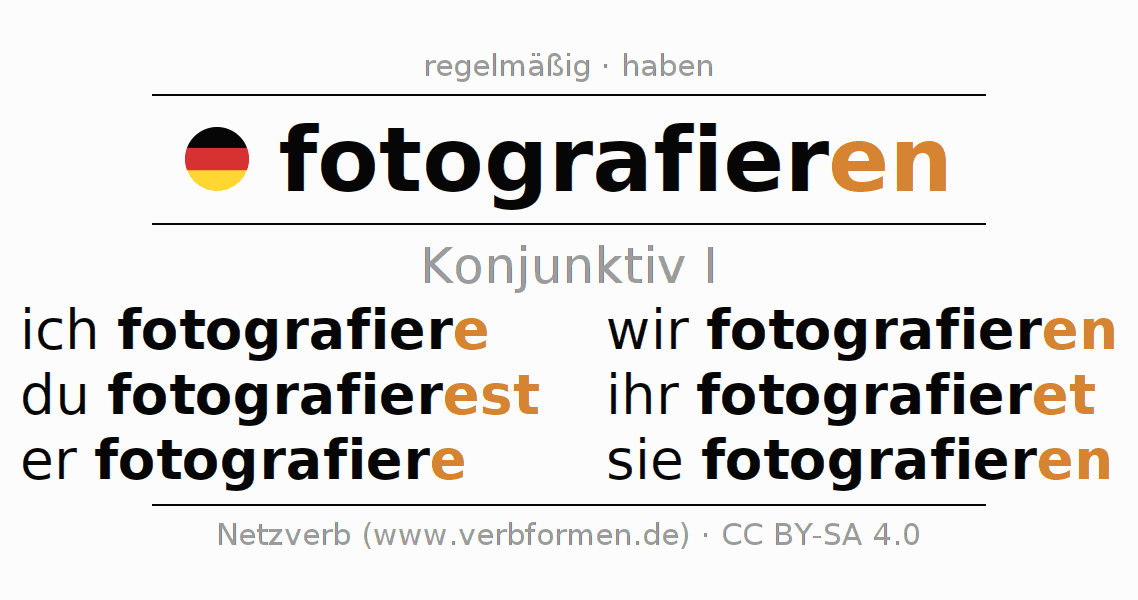 Das Verb fotografieren vollständig in allen Personen und Numeri im Konjunktiv Präsens konjugiert