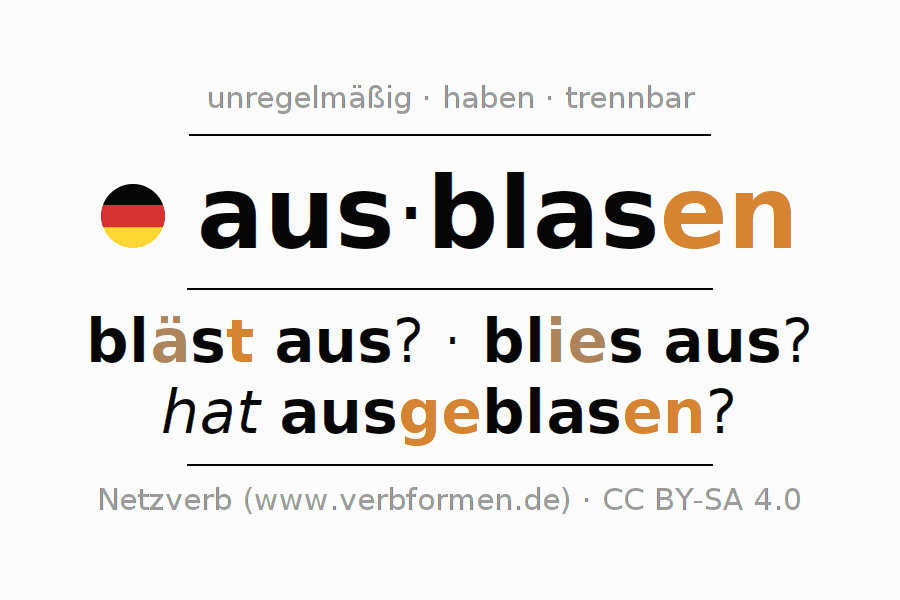 Die Konjugation von ausblasen im Konjunktiv Präsens Möglichkeitsform Aktiv ist: blase ich aus?, blasest du aus?, blase er aus?, blasen wir aus?, blaset ihr aus?, blasen sie aus?.Die Bildung dieser Formen entspricht gewissen grammatischen Regeln. So auch die Vorgaben zur Konjugation der einfachen Verbformen von ausblasen im Konjunktiv I. Kommentare ☆
