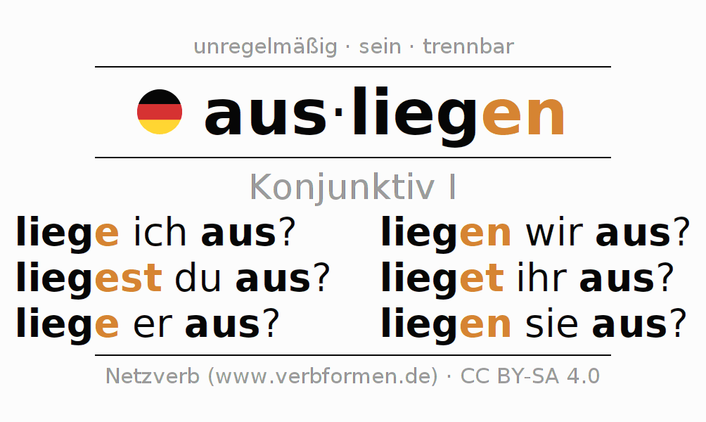 Die Konjugation von ausliegen im Konjunktiv Präsens Möglichkeitsform Aktiv ist: liege ich aus?, liegest du aus?, liege er aus?, liegen wir aus?, lieget ihr aus?, liegen sie aus?.Die Bildung dieser Formen entspricht gewissen grammatischen Regeln. So auch die Vorgaben zur Konjugation der einfachen Verbformen von ausliegen im Konjunktiv I. Kommentare ☆