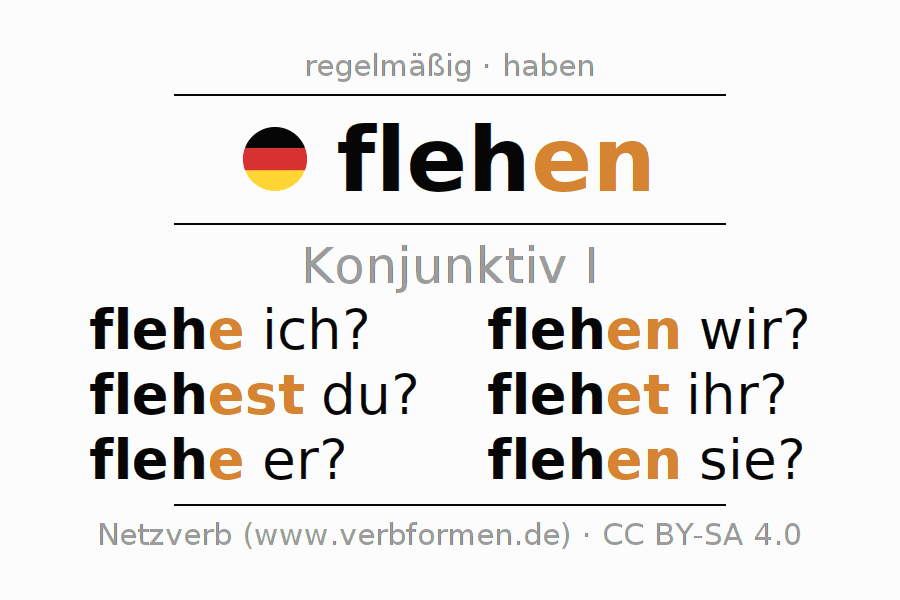 Das Verb flehen vollständig in allen Personen und Numeri im Konjunktiv Präsens konjugiert