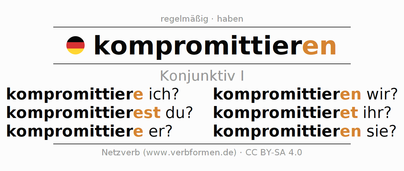 Das Verb kompromittieren vollständig in allen Personen und Numeri im Konjunktiv Präsens konjugiert