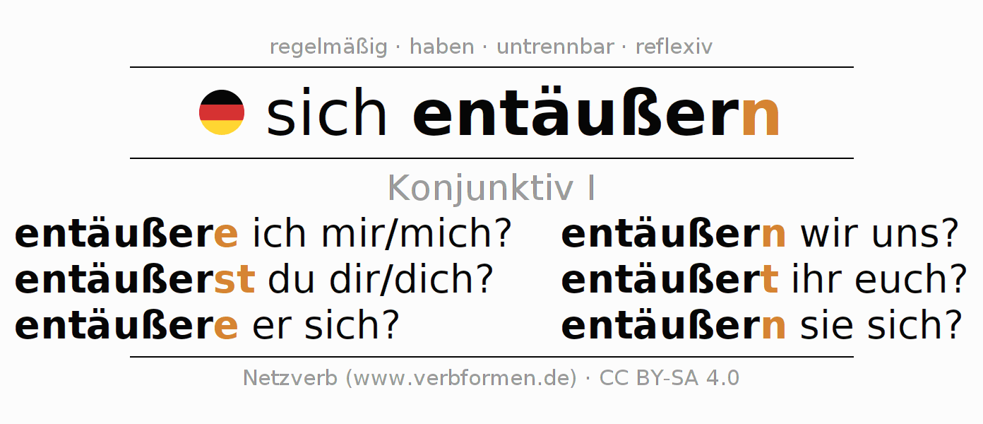 Das Verb sich entäußern vollständig in allen Personen und Numeri im Konjunktiv Präsens konjugiert