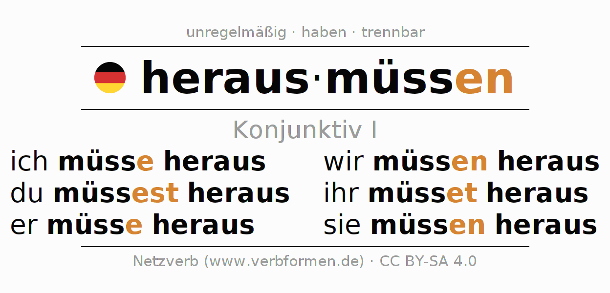 Das Verb herausmüssen vollständig in allen Personen und Numeri im Konjunktiv Präsens konjugiert