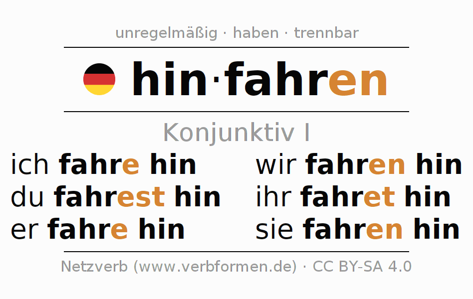 Das Verb hinfahren vollständig in allen Personen und Numeri im Konjunktiv Präsens konjugiert