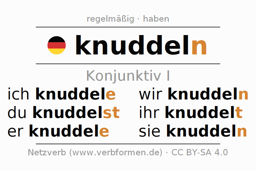 Das Verb knuddeln vollständig in allen Personen und Numeri im Konjunktiv Präsens konjugiert