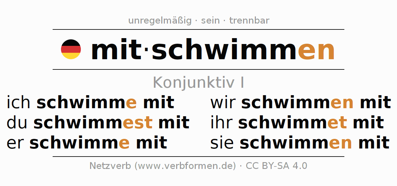 Das Verb mitschwimmen vollständig in allen Personen und Numeri im Konjunktiv Präsens konjugiert