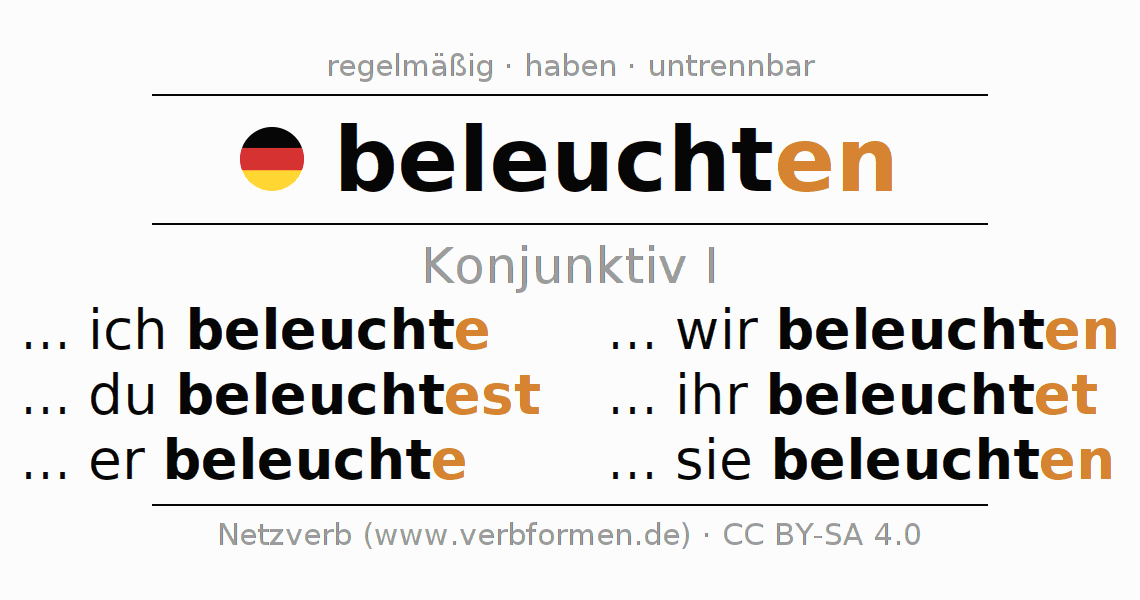 Das Verb beleuchten vollständig in allen Personen und Numeri im Konjunktiv Präsens konjugiert