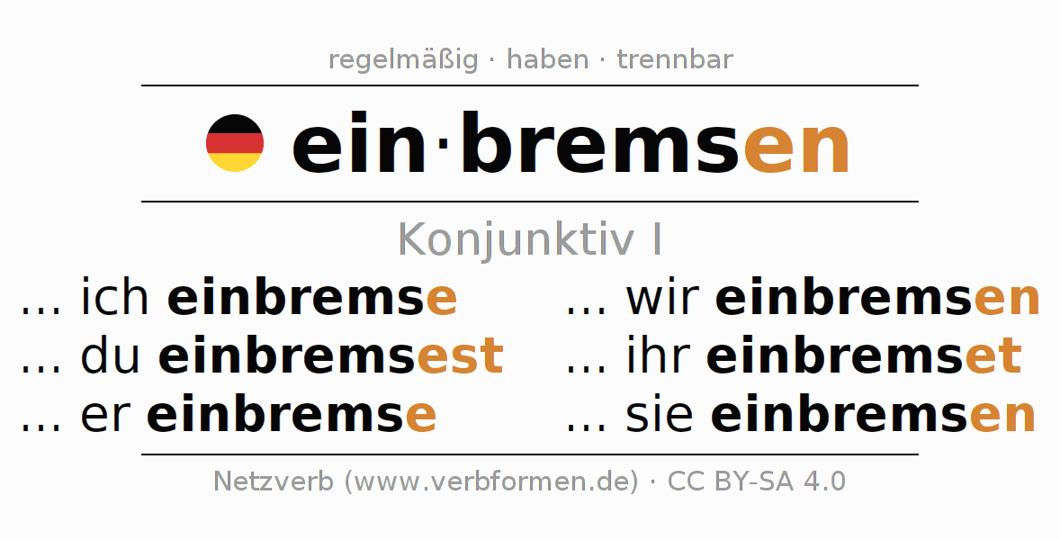 Die Konjugation von einbremsen im Konjunktiv Präsens Möglichkeitsform Aktiv ist: ... ich einbremse, ... du einbremsest, ... er einbremse, ... wir einbremsen, ... ihr einbremset, ... sie einbremsen.Die Bildung dieser Formen entspricht gewissen grammatischen Regeln. So auch die Vorgaben zur Konjugation der einfachen Verbformen von einbremsen im Konjunktiv I. Kommentare ☆