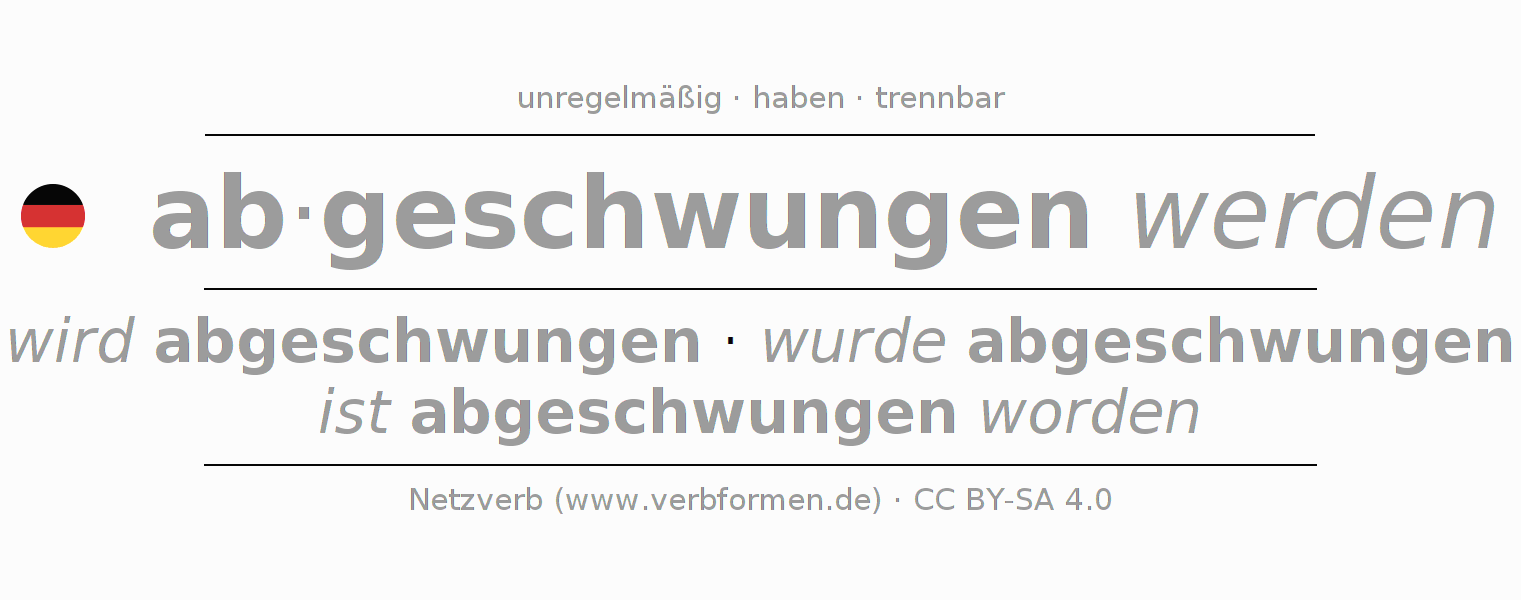 Die Konjugation von abschwingen im Konjunktiv Präsens Möglichkeitsform Vorgangspassiv ist: ich werde abgeschwungen, du werdest abgeschwungen, er werde abgeschwungen, wir werden abgeschwungen, ihr werdet abgeschwungen, sie werden abgeschwungen.Die Bildung dieser Formen entspricht gewissen grammatischen Regeln. So auch die Vorgaben zur Konjugation der einfachen Verbformen von abschwingen im Konjunktiv I. Kommentare ☆