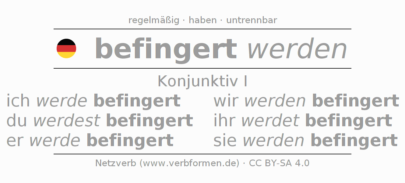 Die Konjugation von befingern im Konjunktiv Präsens Möglichkeitsform Vorgangspassiv ist: ich werde befingert, du werdest befingert, er werde befingert, wir werden befingert, ihr werdet befingert, sie werden befingert.Die Bildung dieser Formen entspricht gewissen grammatischen Regeln. So auch die Vorgaben zur Konjugation der einfachen Verbformen von befingern im Konjunktiv I. Kommentare ☆