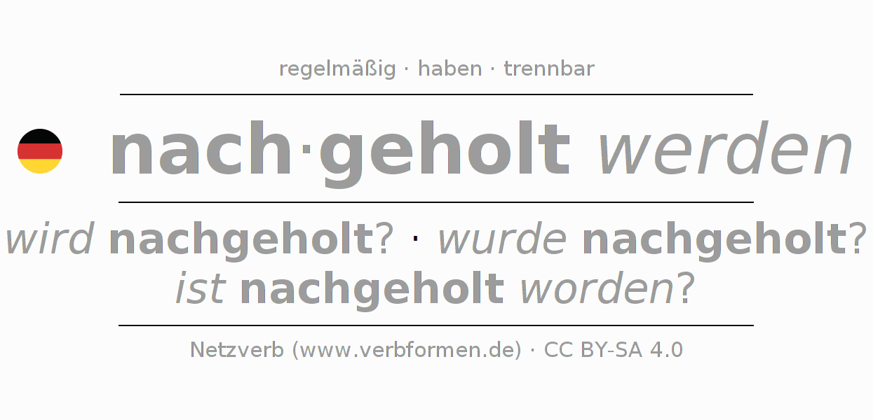Die Konjugation von nachholen im Konjunktiv Präsens Möglichkeitsform Vorgangspassiv ist: werde ich nachgeholt?, werdest du nachgeholt?, werde er nachgeholt?, werden wir nachgeholt?, werdet ihr nachgeholt?, werden sie nachgeholt?.Die Bildung dieser Formen entspricht gewissen grammatischen Regeln. So auch die Vorgaben zur Konjugation der einfachen Verbformen von nachholen im Konjunktiv I. Kommentare ☆