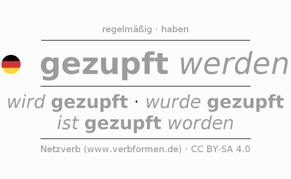 Die Konjugation von zupfen im Konjunktiv Präsens Möglichkeitsform Vorgangspassiv ist: ich werde gezupft, du werdest gezupft, er werde gezupft, wir werden gezupft, ihr werdet gezupft, sie werden gezupft.Die Bildung dieser Formen entspricht gewissen grammatischen Regeln. So auch die Vorgaben zur Konjugation der einfachen Verbformen von zupfen im Konjunktiv I. Kommentare ☆