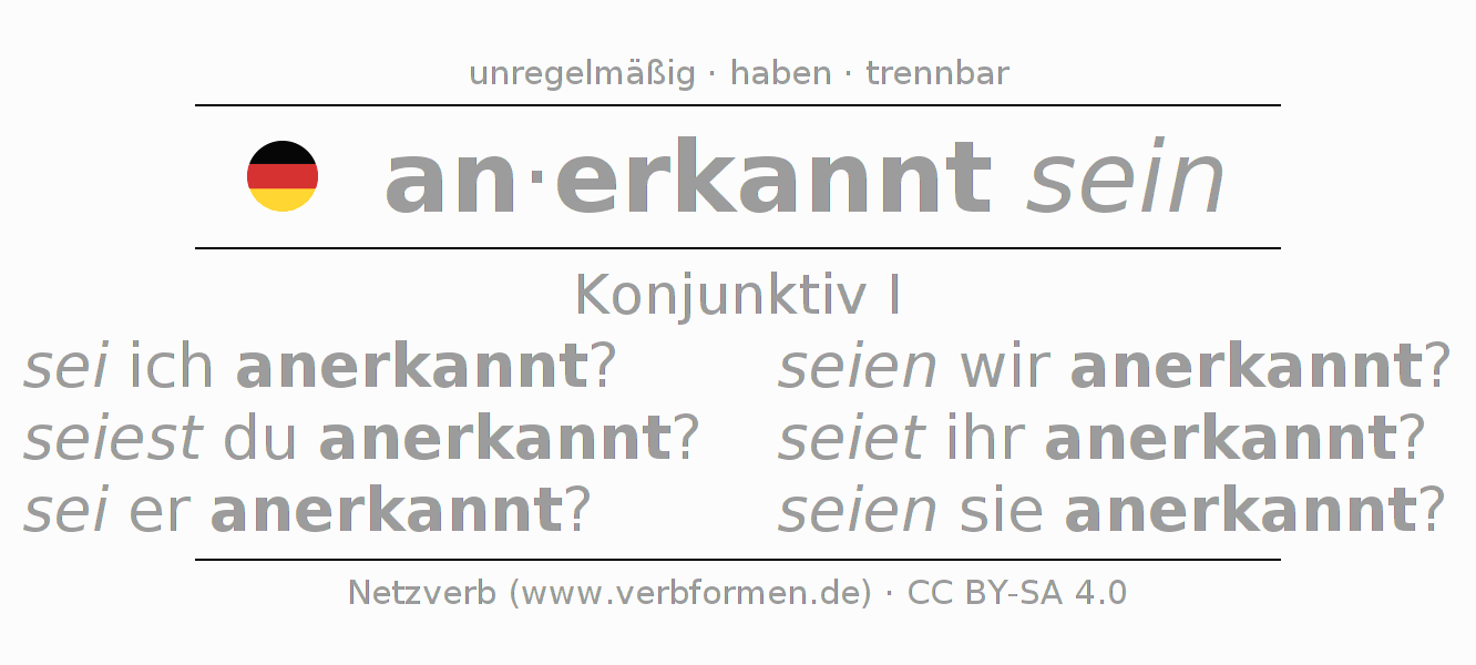 Die Konjugation von anerkennen im Konjunktiv Präsens Möglichkeitsform Zustandspassiv ist: sei ich anerkannt?, seiest du anerkannt?, sei er anerkannt?, seien wir anerkannt?, seiet ihr anerkannt?, seien sie anerkannt?.Die Bildung dieser Formen entspricht gewissen grammatischen Regeln. So auch die Vorgaben zur Konjugation der einfachen Verbformen von anerkennen im Konjunktiv I. 4Kommentare ☆5.0