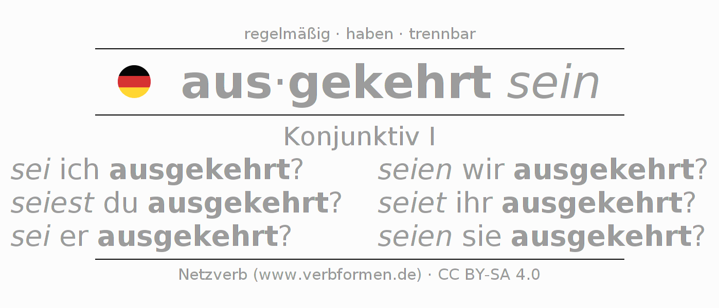Die Konjugation von auskehren im Konjunktiv Präsens Möglichkeitsform Zustandspassiv ist: sei ich ausgekehrt?, seiest du ausgekehrt?, sei er ausgekehrt?, seien wir ausgekehrt?, seiet ihr ausgekehrt?, seien sie ausgekehrt?.Die Bildung dieser Formen entspricht gewissen grammatischen Regeln. So auch die Vorgaben zur Konjugation der einfachen Verbformen von auskehren im Konjunktiv I. Kommentare ☆