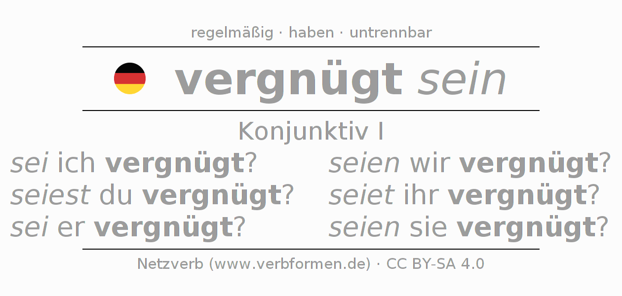 Die Konjugation von vergnügen im Konjunktiv Präsens Möglichkeitsform Zustandspassiv ist: sei ich vergnügt?, seiest du vergnügt?, sei er vergnügt?, seien wir vergnügt?, seiet ihr vergnügt?, seien sie vergnügt?.Die Bildung dieser Formen entspricht gewissen grammatischen Regeln. So auch die Vorgaben zur Konjugation der einfachen Verbformen von vergnügen im Konjunktiv I. Kommentare ☆