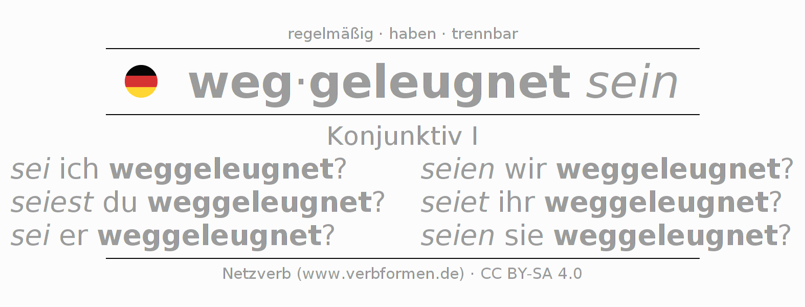 Das Verb wegleugnen vollständig in allen Personen und Numeri im Konjunktiv Präsens konjugiert