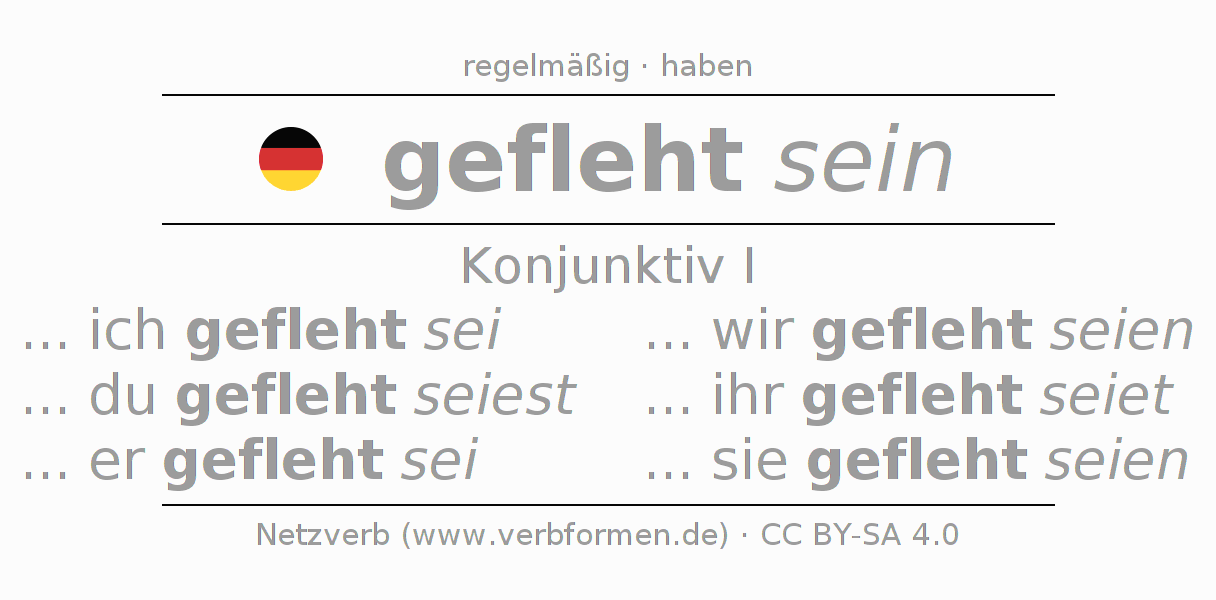 Das Verb flehen vollständig in allen Personen und Numeri im Konjunktiv Präsens konjugiert