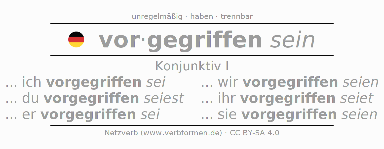 Das Verb vorgreifen vollständig in allen Personen und Numeri im Konjunktiv Präsens konjugiert