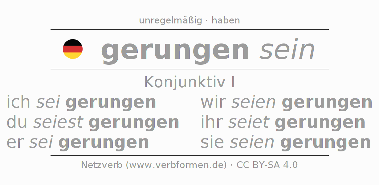 Die Konjugation von ringen im Konjunktiv Präsens Möglichkeitsform Zustandspassiv ist: ich sei gerungen, du seiest gerungen, er sei gerungen, wir seien gerungen, ihr seiet gerungen, sie seien gerungen.Die Bildung dieser Formen entspricht gewissen grammatischen Regeln. So auch die Vorgaben zur Konjugation der einfachen Verbformen von ringen im Konjunktiv I. Kommentare ☆