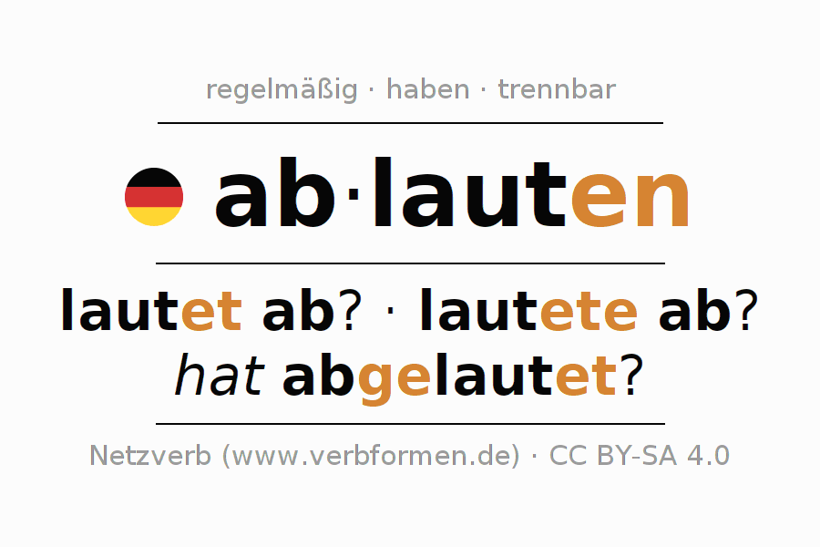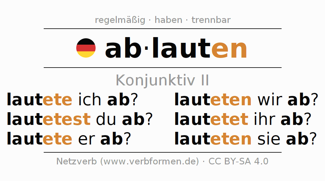 Die Konjugation von ablauten im Konjunktiv Präteritum Möglichkeitsform Aktiv ist: lautete ich ab?, lautetest du ab?, lautete er ab?, lauteten wir ab?, lautetet ihr ab?, lauteten sie ab?.Die Bildung dieser Formen entspricht gewissen grammatischen Regeln. So auch die Vorgaben zur Konjugation der einfachen Verbformen von ablauten im Konjunktiv II. Kommentare ☆