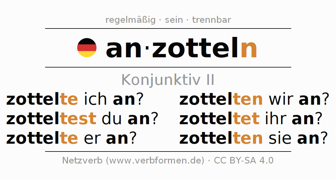 Das Verb anzotteln vollständig in allen Personen und Numeri im Konjunktiv Präteritum konjugiert