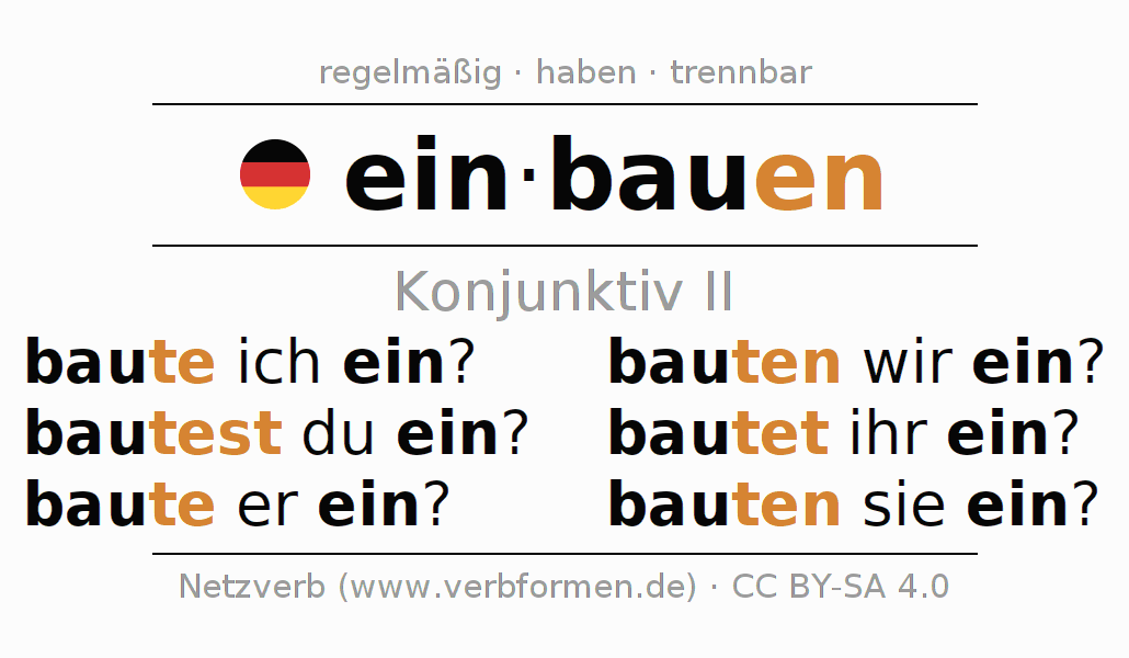 Die Konjugation von einbauen im Konjunktiv Präteritum Möglichkeitsform Aktiv ist: baute ich ein?, bautest du ein?, baute er ein?, bauten wir ein?, bautet ihr ein?, bauten sie ein?.Die Bildung dieser Formen entspricht gewissen grammatischen Regeln. So auch die Vorgaben zur Konjugation der einfachen Verbformen von einbauen im Konjunktiv II. Kommentare ☆