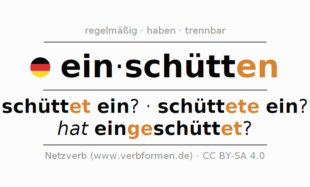 Die Konjugation von einschütten im Konjunktiv Präteritum Möglichkeitsform Aktiv ist: schüttete ich ein?, schüttetest du ein?, schüttete er ein?, schütteten wir ein?, schüttetet ihr ein?, schütteten sie ein?.Die Bildung dieser Formen entspricht gewissen grammatischen Regeln. So auch die Vorgaben zur Konjugation der einfachen Verbformen von einschütten im Konjunktiv II. Kommentare ☆