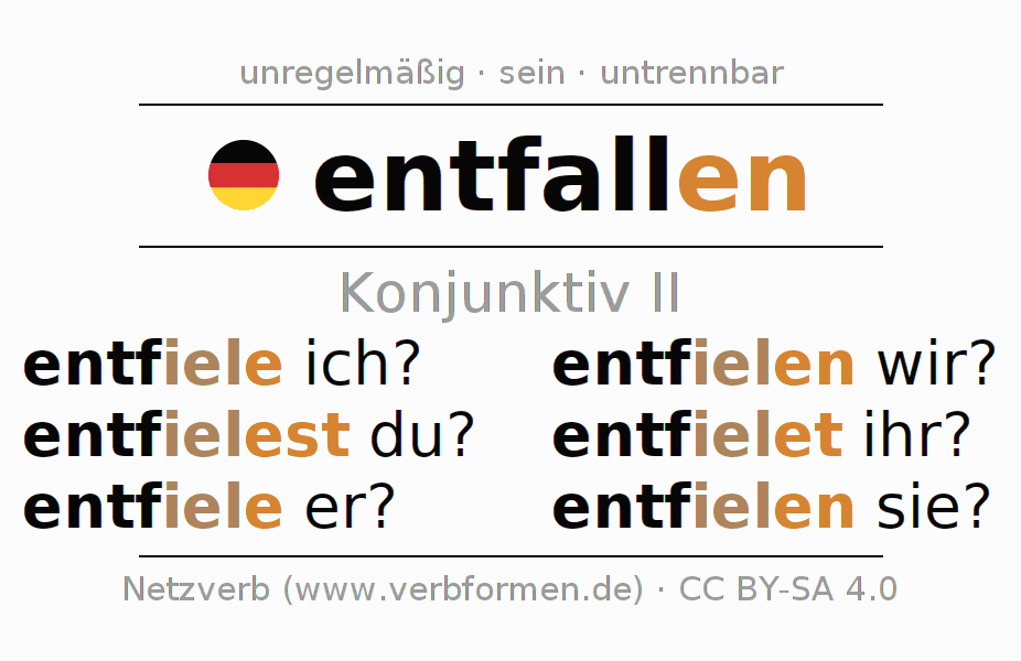 Die Konjugation von entfallen im Konjunktiv Präteritum Möglichkeitsform Aktiv ist: entfiele ich?, entfielest du?, entfiele er?, entfielen wir?, entfielet ihr?, entfielen sie?.Die Bildung dieser Formen entspricht gewissen grammatischen Regeln. So auch die Vorgaben zur Konjugation der einfachen Verbformen von entfallen im Konjunktiv II. Kommentare ☆