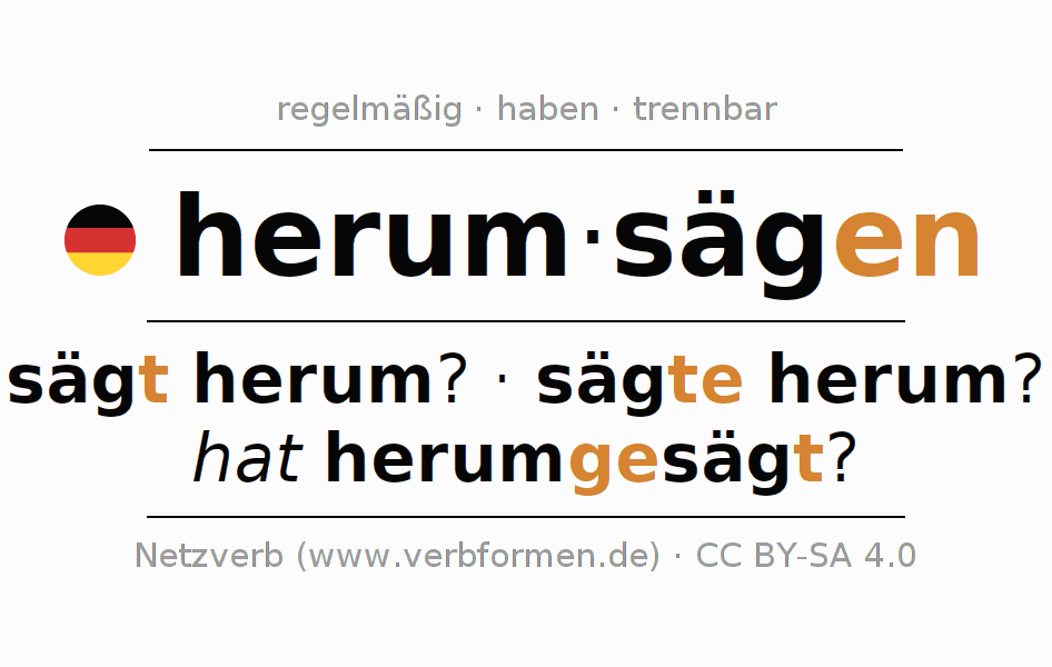 Die Konjugation von herumsägen im Konjunktiv Präteritum Möglichkeitsform Aktiv ist: sägte ich herum?, sägtest du herum?, sägte er herum?, sägten wir herum?, sägtet ihr herum?, sägten sie herum?.Die Bildung dieser Formen entspricht gewissen grammatischen Regeln. So auch die Vorgaben zur Konjugation der einfachen Verbformen von herumsägen im Konjunktiv II. Kommentare ☆
