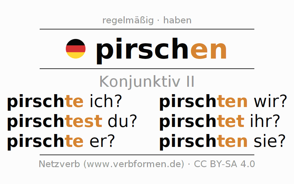 Die Konjugation von pirschen im Konjunktiv Präteritum Möglichkeitsform Aktiv ist: pirschte ich?, pirschtest du?, pirschte er?, pirschten wir?, pirschtet ihr?, pirschten sie?.Die Bildung dieser Formen entspricht gewissen grammatischen Regeln. So auch die Vorgaben zur Konjugation der einfachen Verbformen von pirschen im Konjunktiv II. Kommentare ☆